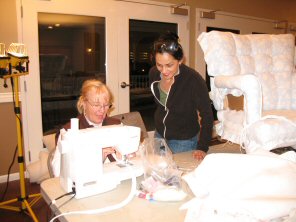 Mary sewing piping with Jackie watching