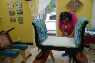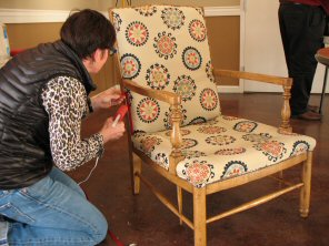 Linda removing fabric from her chair