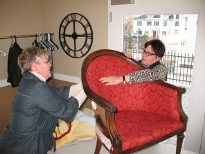 Jennifer and Randy working together to mold  Ultra Suede fabric to the arm of the chair